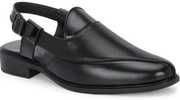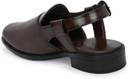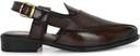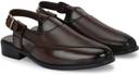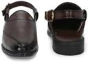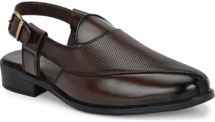 These men's brown sandals feature a sophisticated design with a closed, pointed toe and an open back secured by an adjustable buckle strap. The upper is crafted with a combination of smooth and textured panels, including a perforated laser-printed pattern on the vamp. They are set on a sturdy black sole with a comfortable block heel. The cushioned footbed and anti-skid TPR sole ensure comfort and stability. These sandals are lightweight and suitable for various occasions. Compatible with: Kurtas, pajamas, traditional Indian attire, smart casual trousers, chinos, and dress shirts.