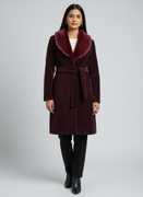 Women’s Solid Wine trench Coat with Faux Fur Collar