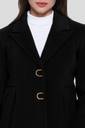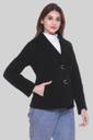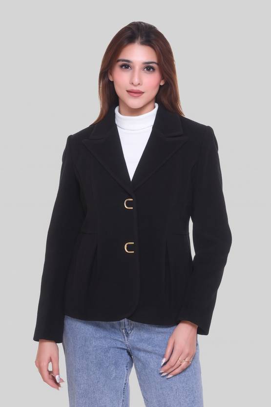 Trendy black women’s blazer with notched lapel, golden closure, and tailored fit. Ideal for office, casual, and party wear