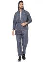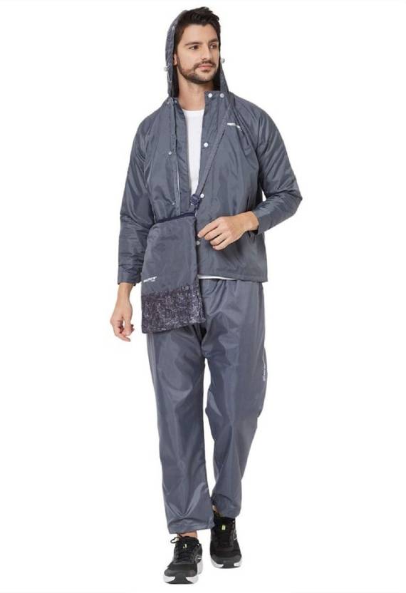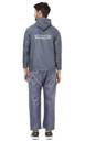 Gray reversible Rainwear with an attached hood and an elasticated drawstring toggle closure with cord lock stopper, a full Zipper with snap Buttons and a placket covering the zipper to ensure that there is no possible place for water to seep through. Long Sleeves and adjustable buttons at cuffs.