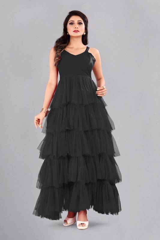 Type: Ruffle Gown || Fabric: Soft Net || Inner: Crepe || Length: Ankle Length|| Sleeves: Sleeveless || Size: 44 Inch