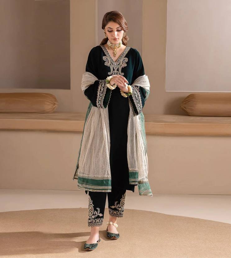 Crafted from high-quality Velvet fabric, this set can offer a luxurious feel and drape that enhances your overall appeal. The material can not only be comfortable but also exceptionally durable, making it a long-standing inclusion in your collection. Also, it may involve hassle-free maintenance, retaining its appearance through seasons and being a favourite for your busy self. Moreover, its understated comfort can make it an appropriate option for long and exhausting events.