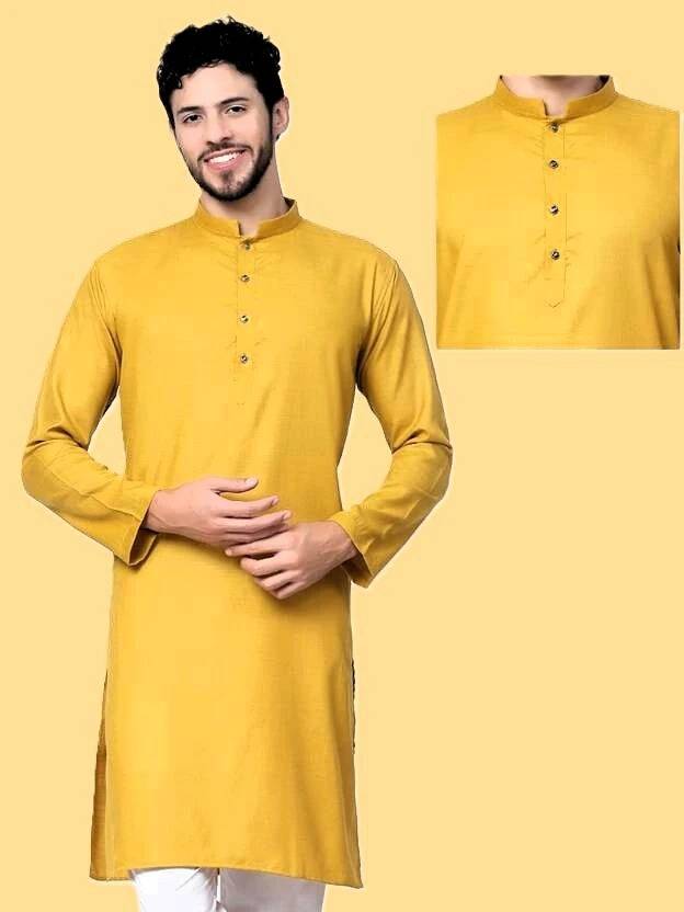 krishu Men Solid Cotton Blend Straight Kurta (Gold)