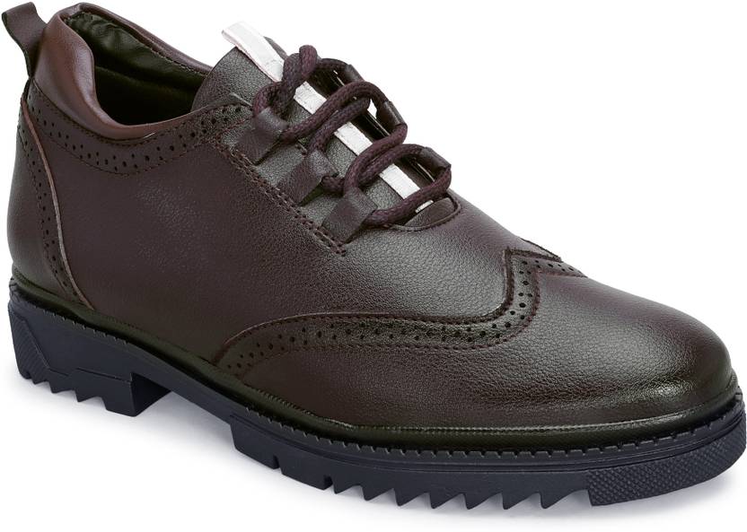 Step into sophisticated style with these classic Oxford shoes featuring an elegant brogue design. The black faux leather upper showcases traditional perforated detailing and wing-tip styling that elevates any formal or business casual outfit. The robust lug sole platform adds a contemporary edge while providing excellent traction and durability for everyday wear. These versatile Oxfords are thoughtfully crafted with a comfortable fit and secure lace-up closure system. The platform design offers subtle height enhancement without compromising stability. The shoes feature precise stitching details and a polished finish that speaks to their quality construction. Perfect for office wear, special occasions, or whenever you want to make a refined style statement. The cushioned footbed and sturdy construction ensure lasting comfort throughout your day. These Oxford shoes seamlessly blend timeless design with modern functionality, making them a valuable addition to any gentleman's wardrobe.