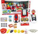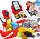 A Toy Cash Register with Checkout Scanner,Fruit Card Reader, Credit Card Machine with Sound & Light. 4 AA Batteries Required (Not Included)., Complete set of grocery products (fruit, vegetables, and some seasonings); and cash drawer with play money & coins and a swipe-able credit card. Your kids will be into this play set and play it all day, so that you could enjoy your free time!