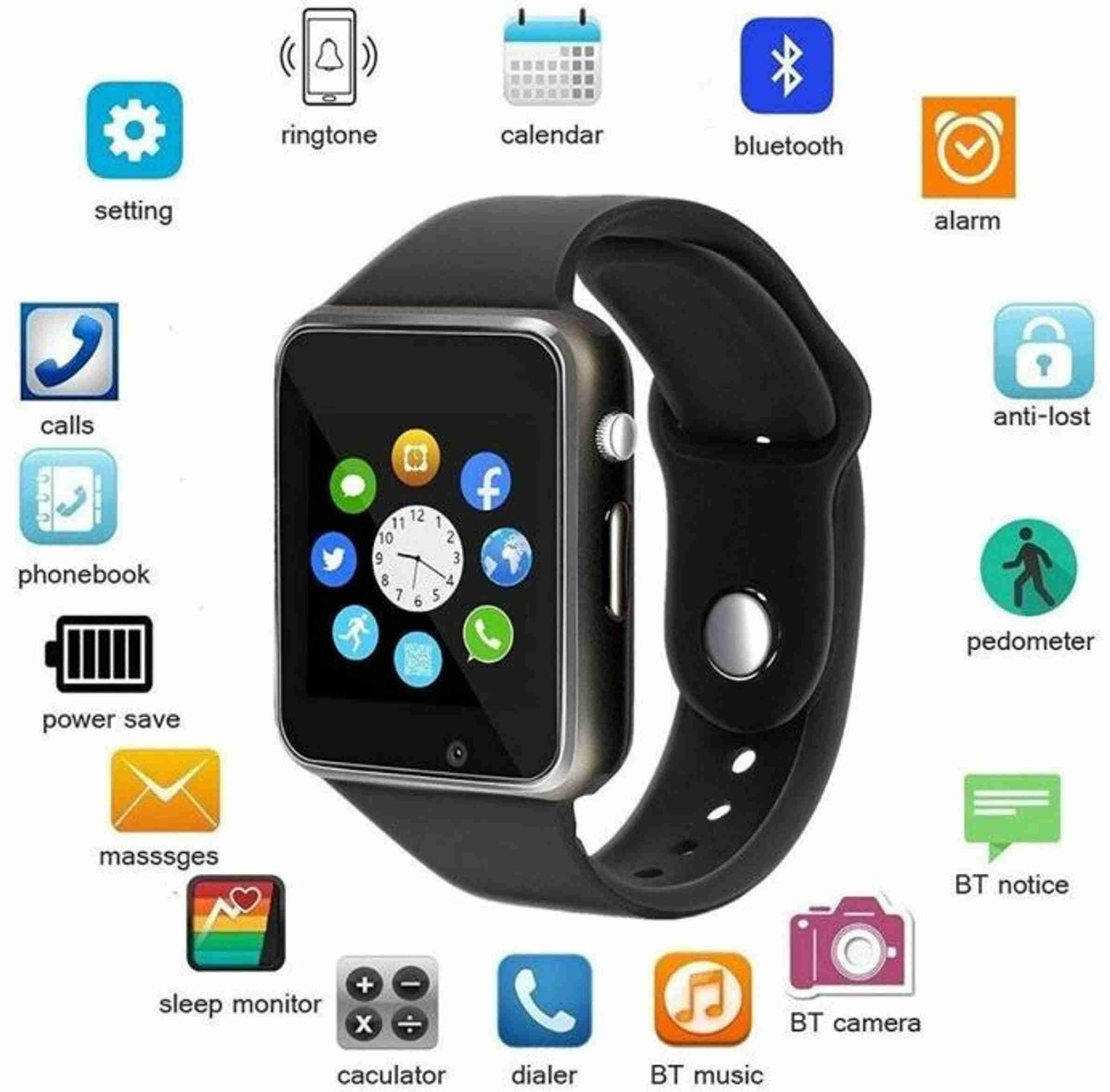 Werner A1 Smart Watch - Support Voice Calling / Bluetooth / SIM / Memory Card / Camera Smartwatch (Black Strap, Free Size)