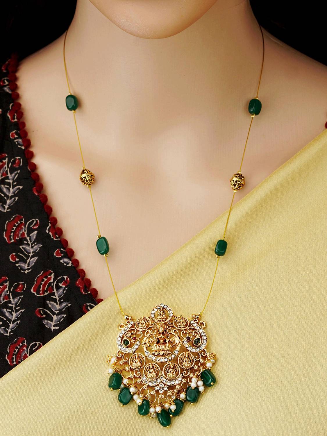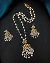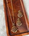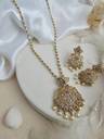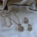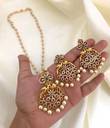 This graceful gold-plated jewelry set is perfect for adding a touch of traditional elegance to any ethnic or party outfit. The set includes a beautifully designed choker necklace featuring intricate detailing with colorful stones and delicate pearl drops, complemented by matching earrings.