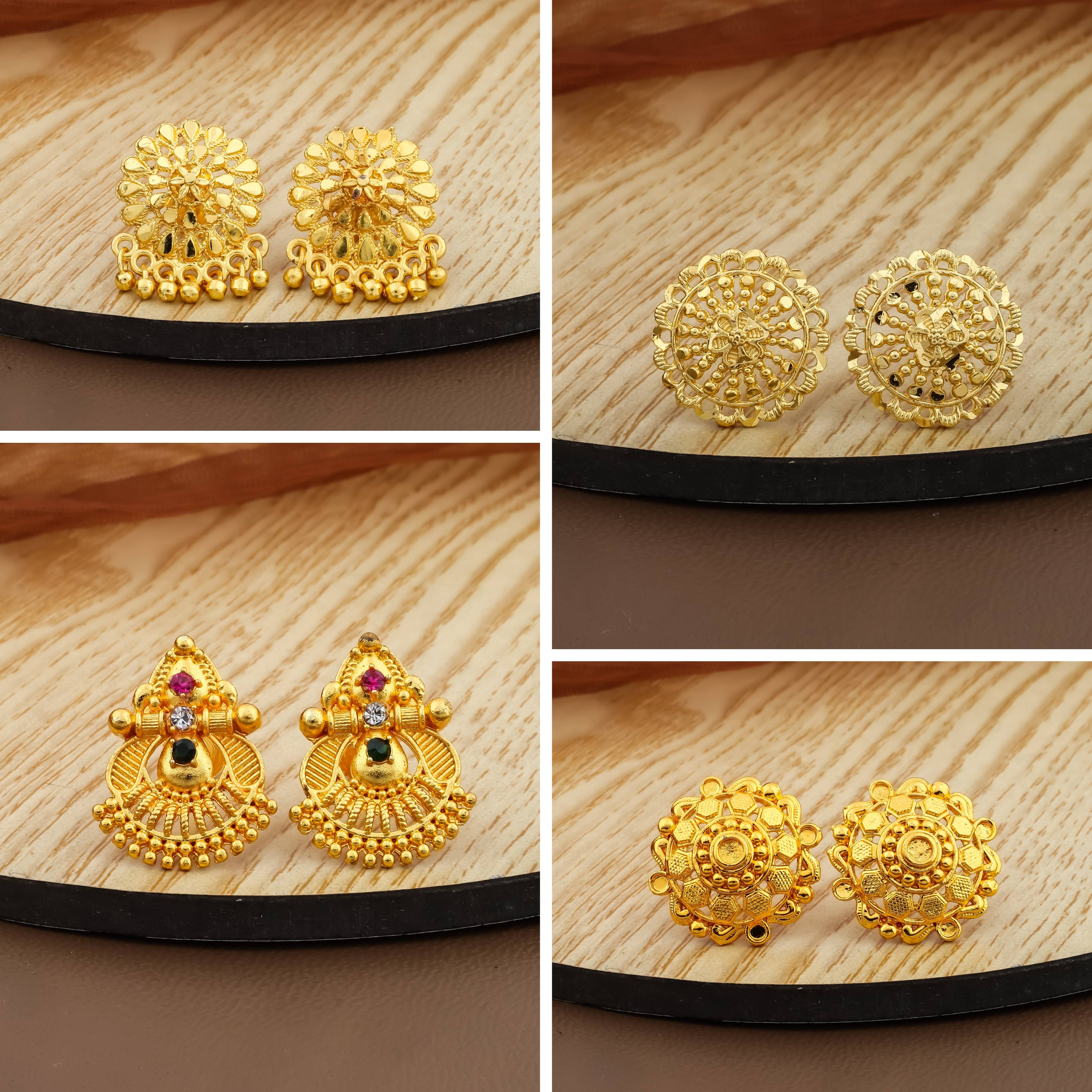 Enhance your ethnic jewellery collection with this beautiful multi-design gold-plated earrings combo set, crafted to reflect timeless Indian artistry. Each pair features intricate detailing inspired by traditional temple and antique designs, making it perfect for festive occasions, weddings, poojas, and cultural events. This combo includes multiple unique stud and jhumka-style earrings, adorned with delicate bead work and elegant colored stone accents. The rich gold finish adds a royal charm, while the lightweight design ensures comfortable all-day wear.