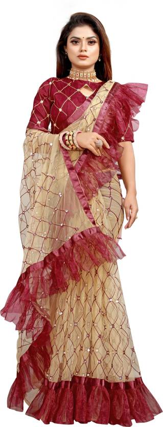 Featuring sequin work and ruffle decorative elements, the charm of this saree lies in its exquisite details that elevate its appeal. The delicate sequin work adds a touch of glamour and sparkle, catching the light and creating a captivating visual effect. The ruffle decorative material further enhances the saree, adding texture and dimension to the embroidery. Together, these elements create a unique and eye-catching design that effortlessly combines elegance and contemporary fashion. This saree stands out in the crowd and adds a touch of luxury to any ensemble.