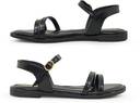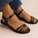 Step out in style with this Black Women's Flat Sandal, perfect for casual wear or light outings. Made from high-quality synthetic leather, it offers a smooth and shiny finish that adds elegance to any outfit. The adjustable buckle strap ensures a perfect fit while providing support for long hours of wear.