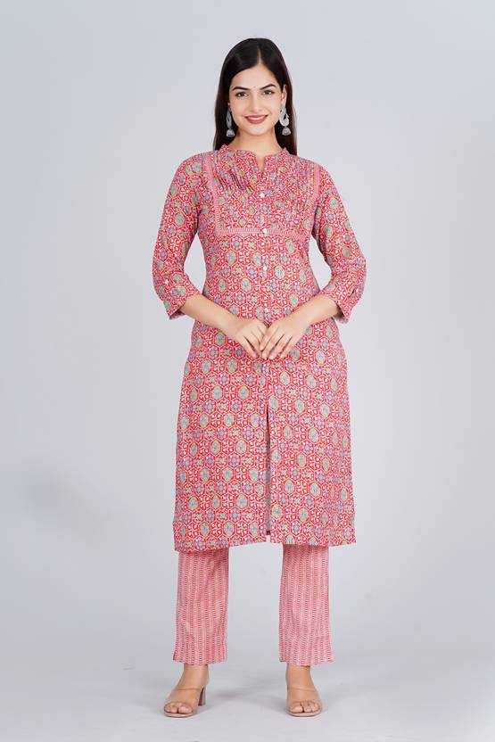 this Lavender , Green and Red Colour Pintex And Button Plaket Worked Cotton V-neck Women Kurta And Pant Set .Embrace timeless elegance and effortless style with our stunning women's kurta and pant set.Unleash your inner style icon! Dress it up with heels and statement jewelry for a festive celebration, or embrace a more relaxed vibe with sandals for everyday wear.