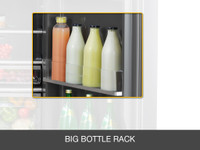 You can store up to four bottles of 2 L capacity in the top door rack of this refrigerator. Additionally, you can store up to six bottles of 1 L capacity in the bottom door rack.