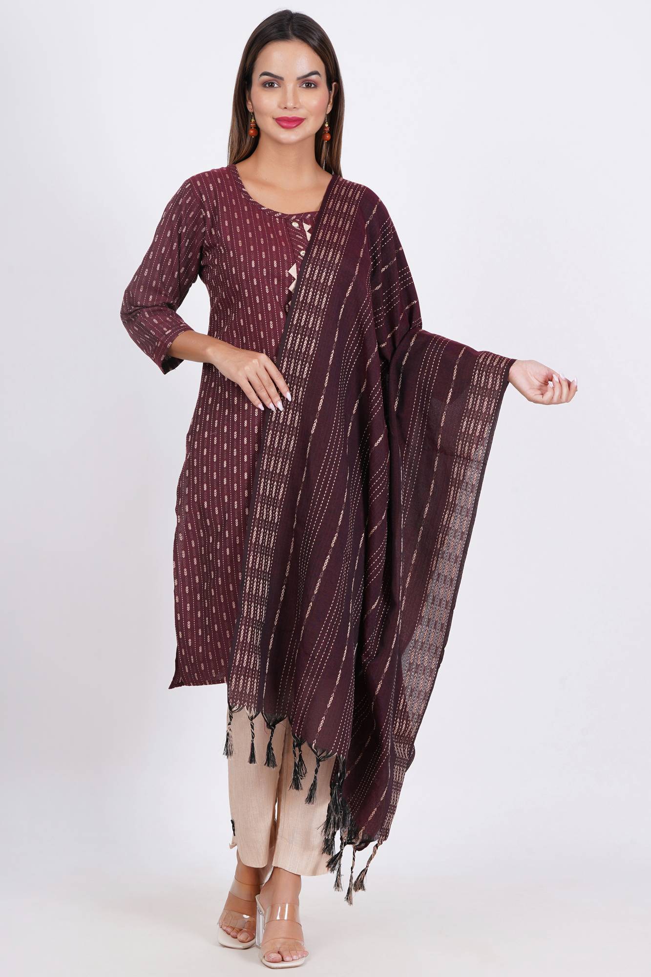 A kurta is the top or tunic in the set. It is usually made from a variety of fabrics, including cotton, silk, chiffon, or georgette, depending on the style and occasion.