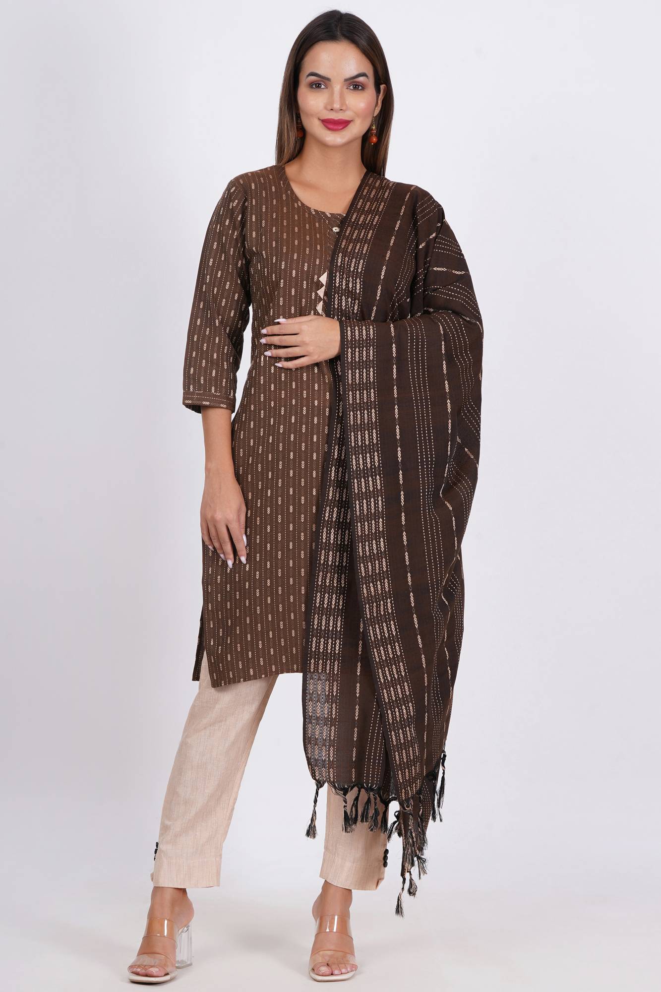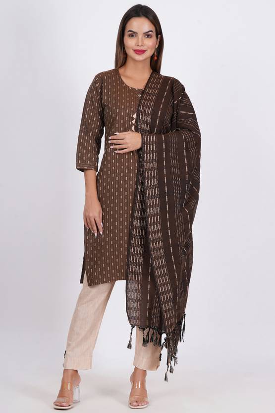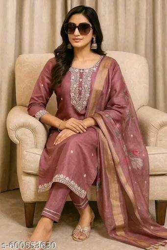 A kurta is the top or tunic in the set. It is usually made from a variety of fabrics, including cotton, silk, chiffon, or georgette, depending on the style and occasion.