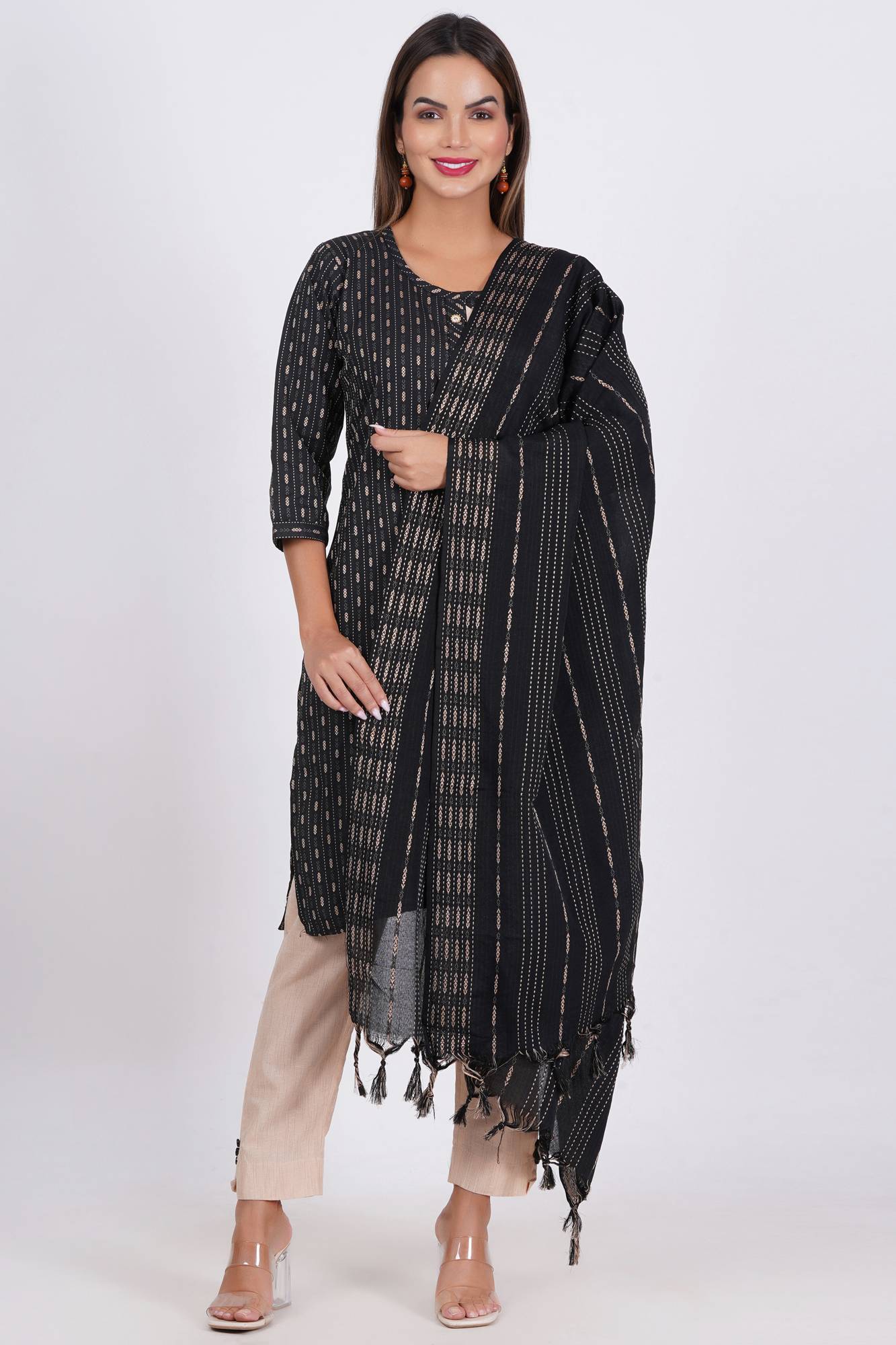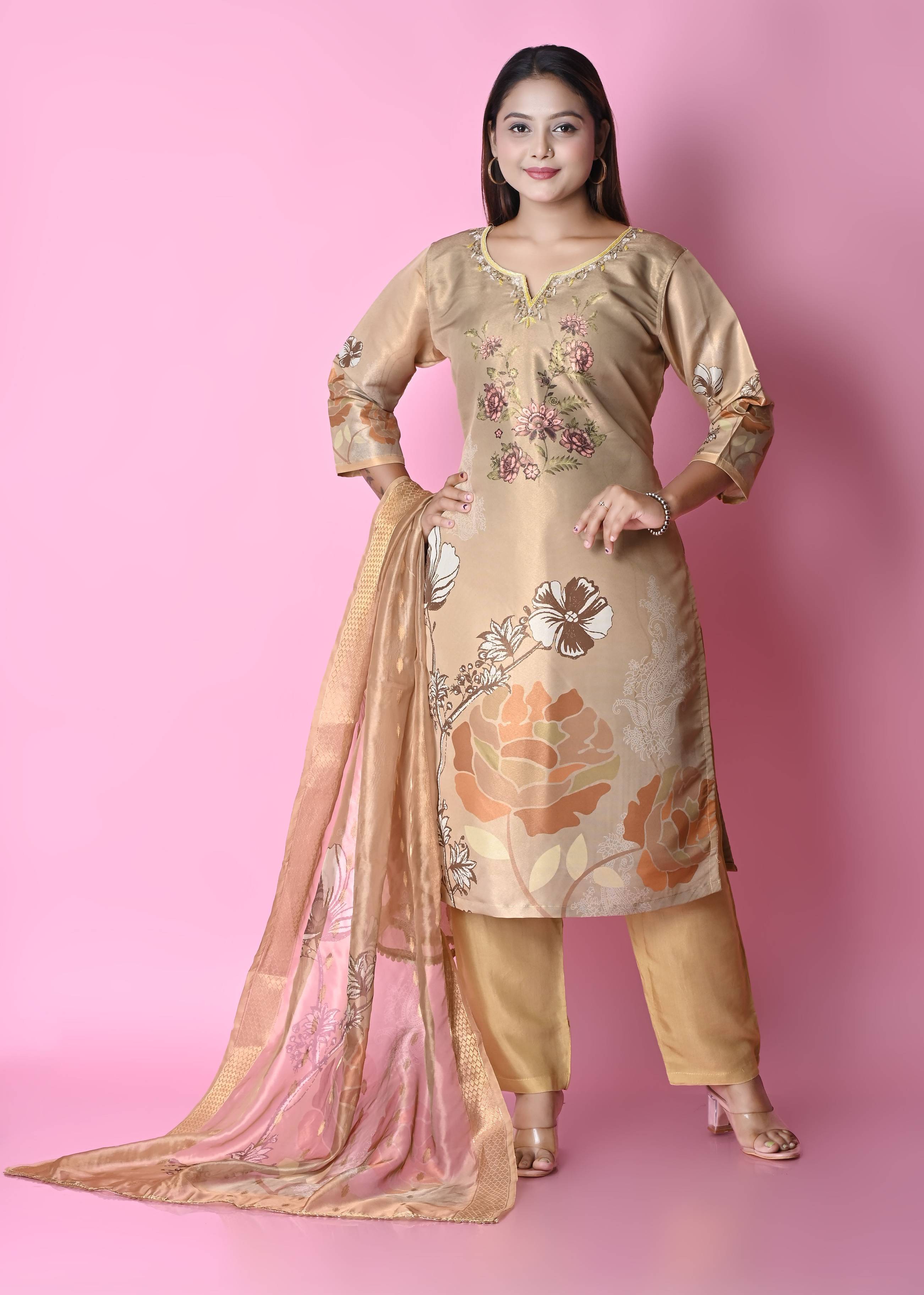 A kurta is the top or tunic in the set. It is usually made from a variety of fabrics, including cotton, silk, chiffon, or georgette, depending on the style and occasion.