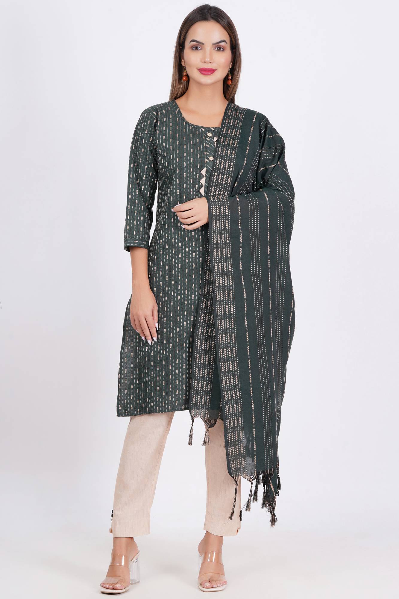 A kurta is the top or tunic in the set. It is usually made from a variety of fabrics, including cotton, silk, chiffon, or georgette, depending on the style and occasion.