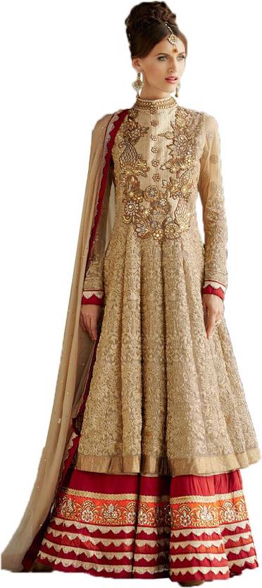 Wholetex Designer Net Long Bronze Elegant Dress Material With Handworked Designer Bordered Full Gold Color Handwork On Dress Followed By Designer Matching Tone Pure Chiffon Dupatta.