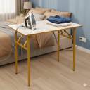 • Elegant Golden Legs – sturdy powder coated steel legs in luxurious gold that add visual appeal and modern looks, Multi Functionality – capable of serving as a study table, office desk, laptop table, computer workstation, ironing board, or intimate dining surface with ease and elegance., Anti Slip & Floor Friendly Feet – equipped with rubber or adjustable base caps to prevent slippage and protect surfaces in busy environments such as offices and restaurants., Portable Yet Robust Design – despite its solidity, the table is light enough to move or fold, making it perfect for on the go events, exhibitions, or dynamic workspaces., Durable & Load Bearing – crafted from solid steel legs and thick board material to support daily workloads, electronics, meals, or even irons., Stylish Marble-Look Table Top - The premium faux-marble finish adds a touch of elegance while being resistant to scratches, stains, and heat., Easy to Clean Surface - Wipe-clean laminate surface ensures low maintenance even after meals, crafting, or ironing.