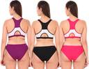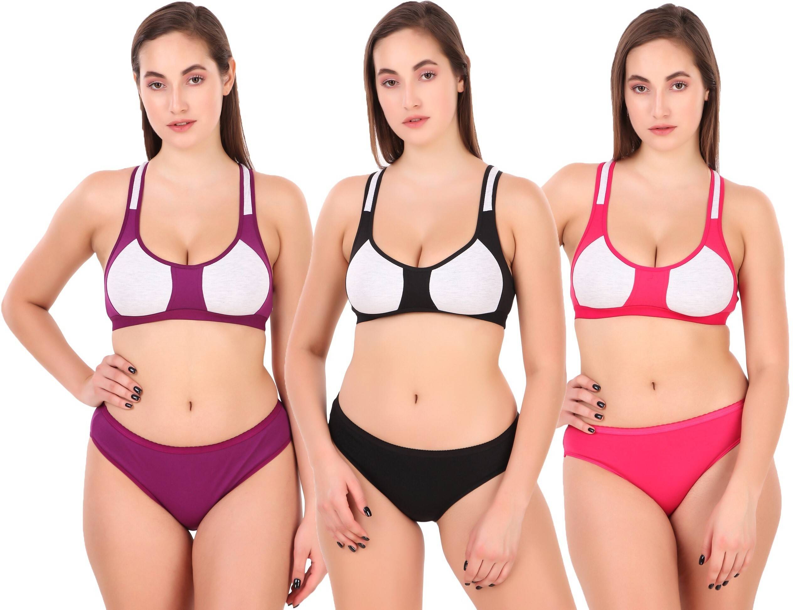 These combo (Purple, Black, Pink) lingerie set made from superior quality branded Lycra Cotton fabric and also used in branded Lycra elastic. These bra and panty set provide proper support and give feel soft against your skin. These bra and panty set are comfortable to wear all day long. Keeping comfort at the top, get this Empisto Lingerie Set. This bra will lend you a perfect fit and provide the desired support. Bra & Panty Set is perfect for Exercising, Gym, Running, Aerobics or yoga. Soft wide straps, and lining for maximum support & comfort. Modern styling with wide arm holes provides complete freedom of movement. It has a high back and full coverage which is perfect gym wear. The Fresh colored panty has elasticized waistbands and Two leg holes which are comfortable. Cross-back styling with wider armholes. Made of cotton elastin stretch fabric providing superior comfort and stretch. Full figure with an elasticated band that allows you to slip into them with ease and assures a firm fit.