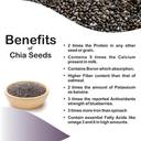 | Other Features | - (1) . • Soak one to two tablespoons of Chia seeds in a glass (240 ml) of water for at least 20-30 minutes. You may add lemon, cinnamon to make it more effective & flavorful. Yours Healthy Drink is ready.,, (2). • Roast the Chia seeds & sprinkle some rock salt. Your healthy snack is ready.,, (3). • Sprinkle Chia seeds on breakfast cereal, soups, fruit & veggie salads & with other breakfast meals also,, (4). • You may mix & soak 1-2 tablespoon Chia seeds as a whole or ground to smoothies, juices, yoghurt, shakes, jams & buttermilk. (Soaking tome can be 15-20 minutes),, (5). • You may add Chia seeds to enhance the nutrition & flavor of bakery products like cake, muffins, pastries & biscuits.