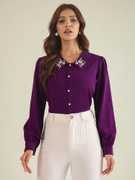 Casual Cuffed Sleeves Embroidered Women Purple Top