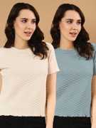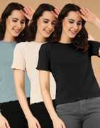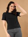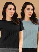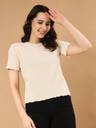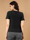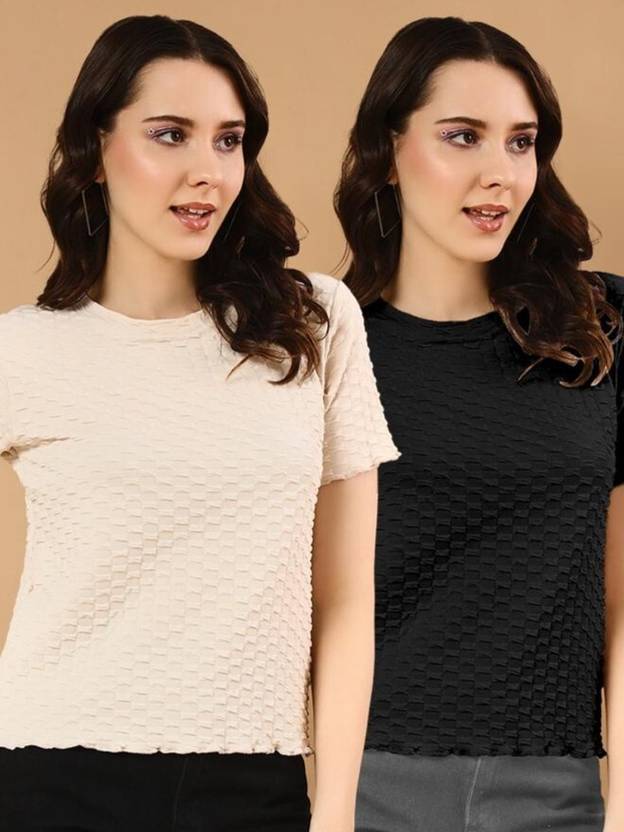 WINGS & HORNS Self Design Women Round Neck Black, Beige T-Shirt