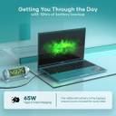 The 65W Type-C charger has you covered - 2 hours of charge in 15 mins and 60% in an hour. Watch a movie, finish debugging a bunch of code, edit a few reels, and finish your assignments and still have some juice left in the Nuvobook because of the immense 55 Wh/4825 mAh battery capacity which gives users up to 10 hours of usage.