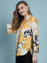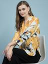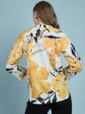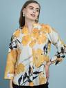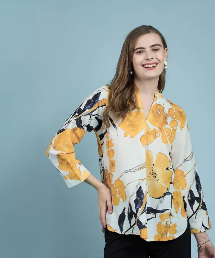 This stylish blouse features a bold floral motif with large-scale abstract flowers in vibrant yellow and orange hues, set against a cream or off-white background. The design is enhanced by contrasting black leaf-like accents, adding a modern, artistic touch. The V-neckline is complemented by a Mandarin-style collar, giving the blouse a sleek, sophisticated look, perfect for both casual and semi-formal occasions.