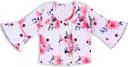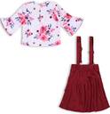 Maroon with white floral printed clothing set. Floral printed t-shirt has round neck and short sleeve. Solid knee length skirt has attached suspenders and button closure