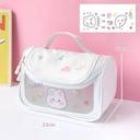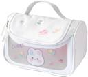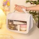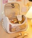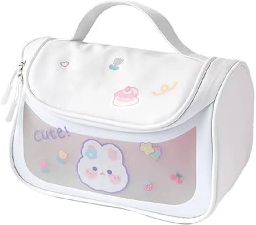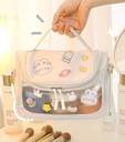 This is a compact toiletry or cosmetic organizer crafted from waterproof PVC material. It features a sturdy carrying handle, double-zip closure, and a roomy interior suitable for storing makeup, skincare items, toiletries, brushes, and small travel essentials. Comes with a decorative sticker for personalization.