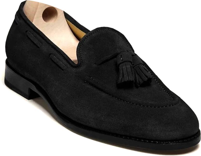 Wolven Milano in black suede calf is an apron fronted penny tassel loafer built on a rounded and wider last, finished with a Stude rubber sole.This Loafers handcrafted soft and sliky loafer will make a valuable addition to your wardrobe, one that will be comfortable all day thanks to the rubber of the soles and the soft linings. Wear them for important work occasions or in everyday situations to add an element of fine detailing to your look.