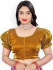 The metallic blouse features Short puff sleeves that are trendy and classy. The Frontless design with hooks and tie-up dori enhances its feminine charm. The Round Neck blouse design complements all face shapes and works well with both sarees and lehengas.