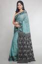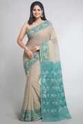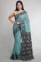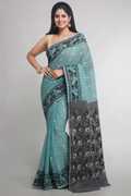 1. 1.Finest Softness: Our Dhakai Jamdani sarees are crafted from the finest soft cotton and art resham silk, ensuring a luxurious and comfortable drape. This Saree comes with 5.5 meter lengh without blouse piece and 1.2 meter width. 2. Art Resham Intricacy: Each saree is adorned with exquisite art resham work, a testament to the dedication and skill of our weavers. 3. Pure Cotton Base: The foundation of our Dhakai Jamdani sarees is pure cotton, offering breathability and comfort, making them ideal for various occasions. The delicate thread work on these sarees is done with high-quality cotton threads. 4. No Blouse Piece: While we don't include a blouse piece, you have the freedom to pair them with a blouse of your choice to create a personalized ensemble. 5. Aqua blue & Black Elegance: The classic combination of Aqua blue & Black in these sarees creates a striking contrast that exudes timeless charm.