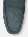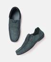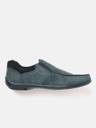 A pair of round toe navy blue solid slip-on sneakers, has regular styling, slip-on leather upper cushioned footbed textured and patterned outsole