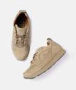 A pair of round toe khaki solid sneakers, has regular styling, lace-up closure Leather upper Cushioned footbed Textured and patterned outsole Warranty: 1 month Warranty provided by brand/manufacturer