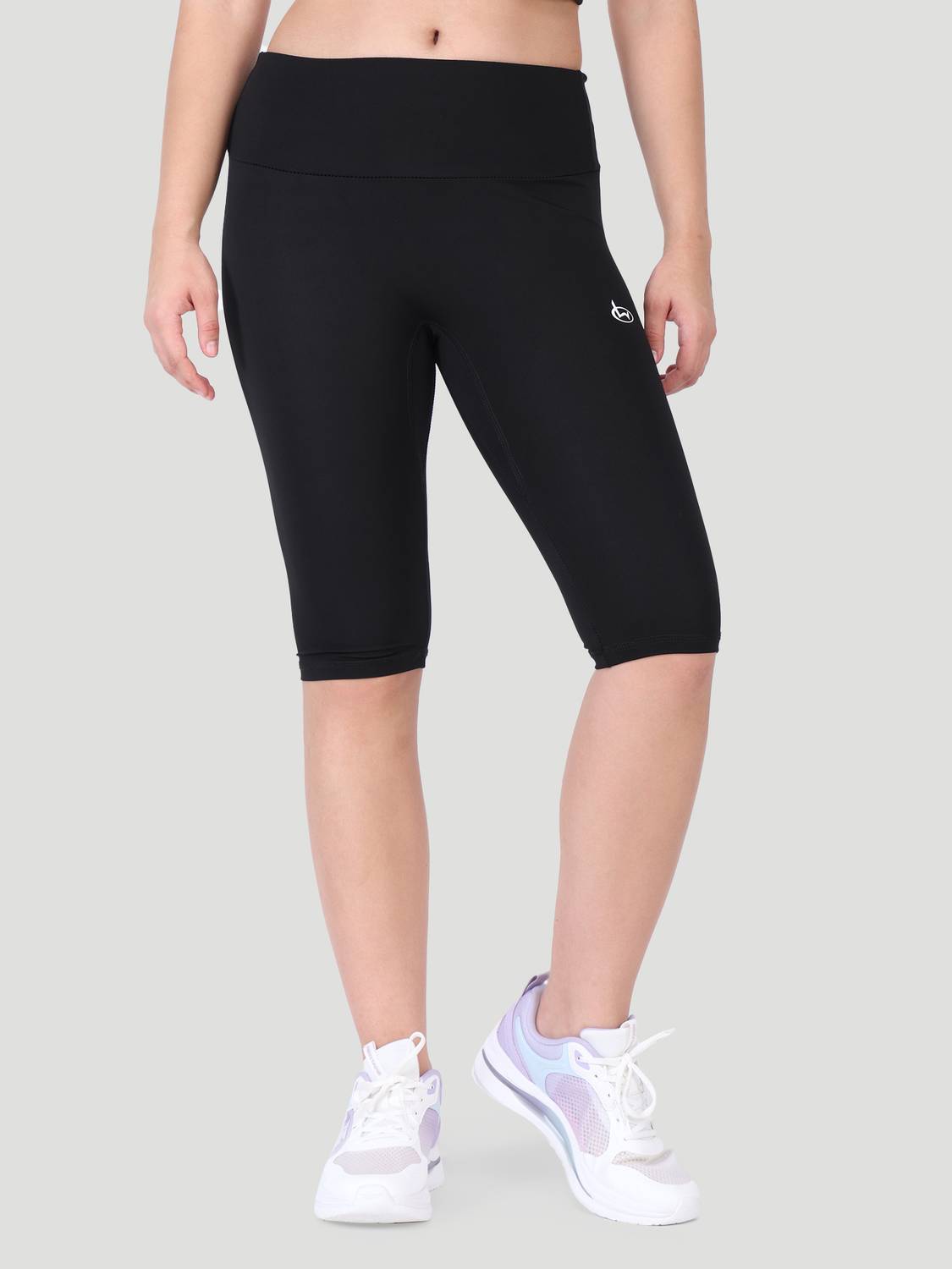 Featuring a solid pattern, enhanced by a minimal logo, these women's capri tights display a simple yet sporty appearance. The minimalist pattern lends a clean and polished look. You can rely on the timeless pattern to maintain a refined, contemporary charm. The classic pattern adds subtle confidence without drawing excess attention. A sporty edge blends with elegance, giving these tights an effortless charm.