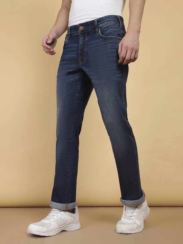 These Wrangler jeans are made from a cotton blend fabric and have a mid waist and straight Millard fit for the ultimate comfort. The dark blue wash lends a magnetic and rugged vibe. Style them up with a button-up shirt and loafers for a fashion-forward look.