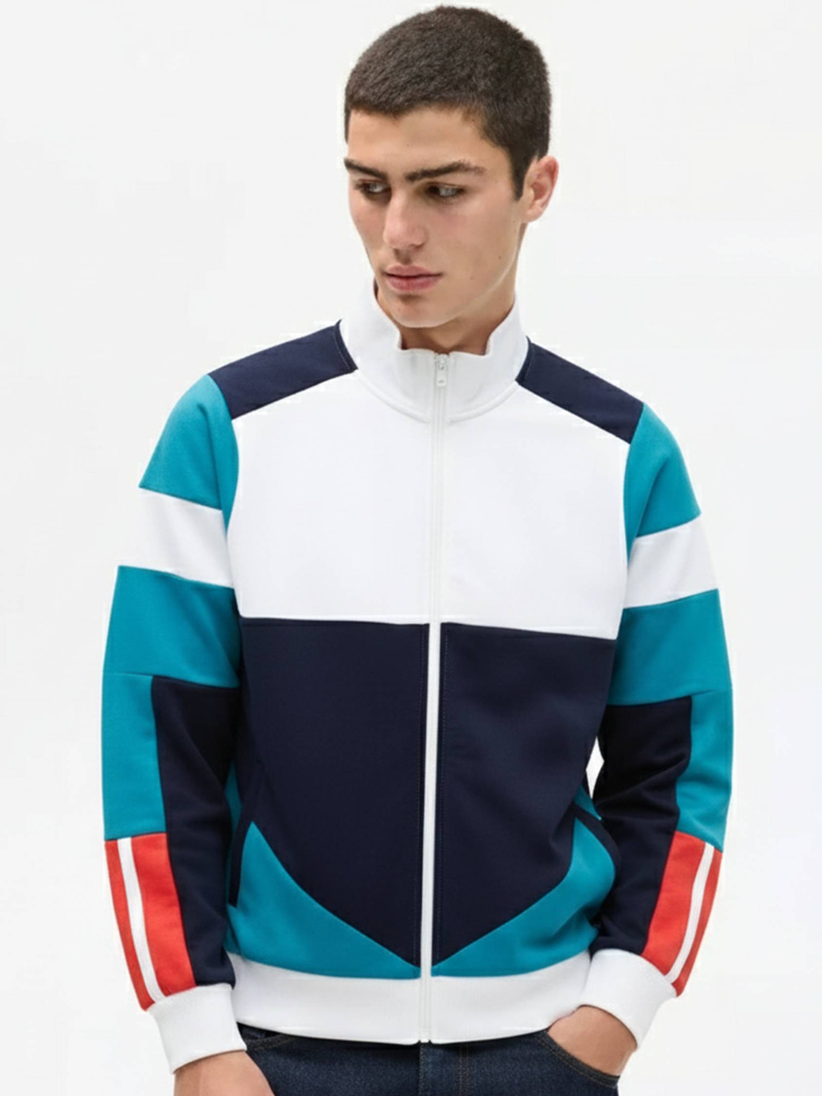 it features a front zipper closure, full sleeves, and two zippered pockets for practicality. The jacket includes contrast black piping and cuff grip for a sporty, modern look. Perfect for windy or light rainy days,