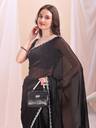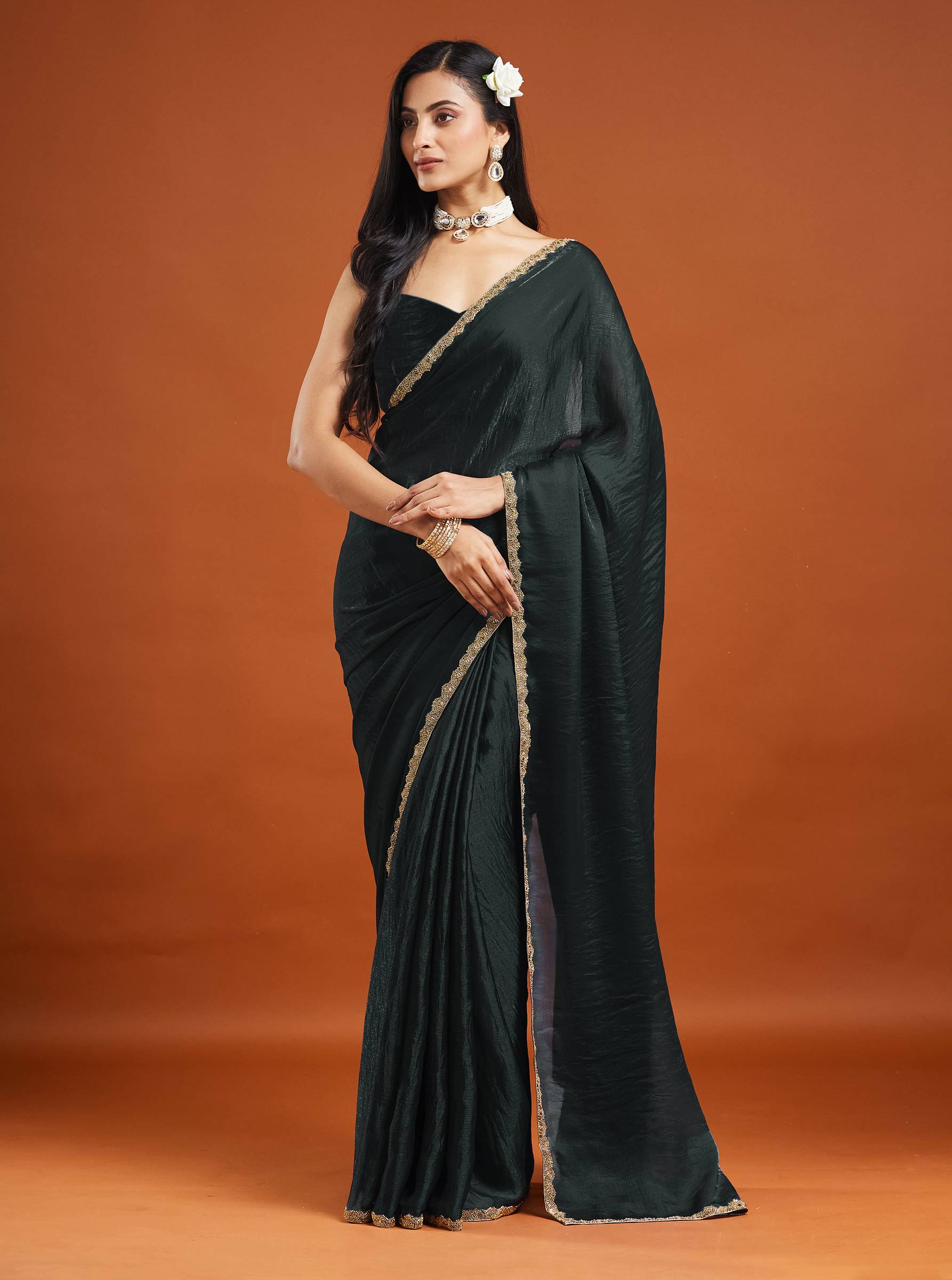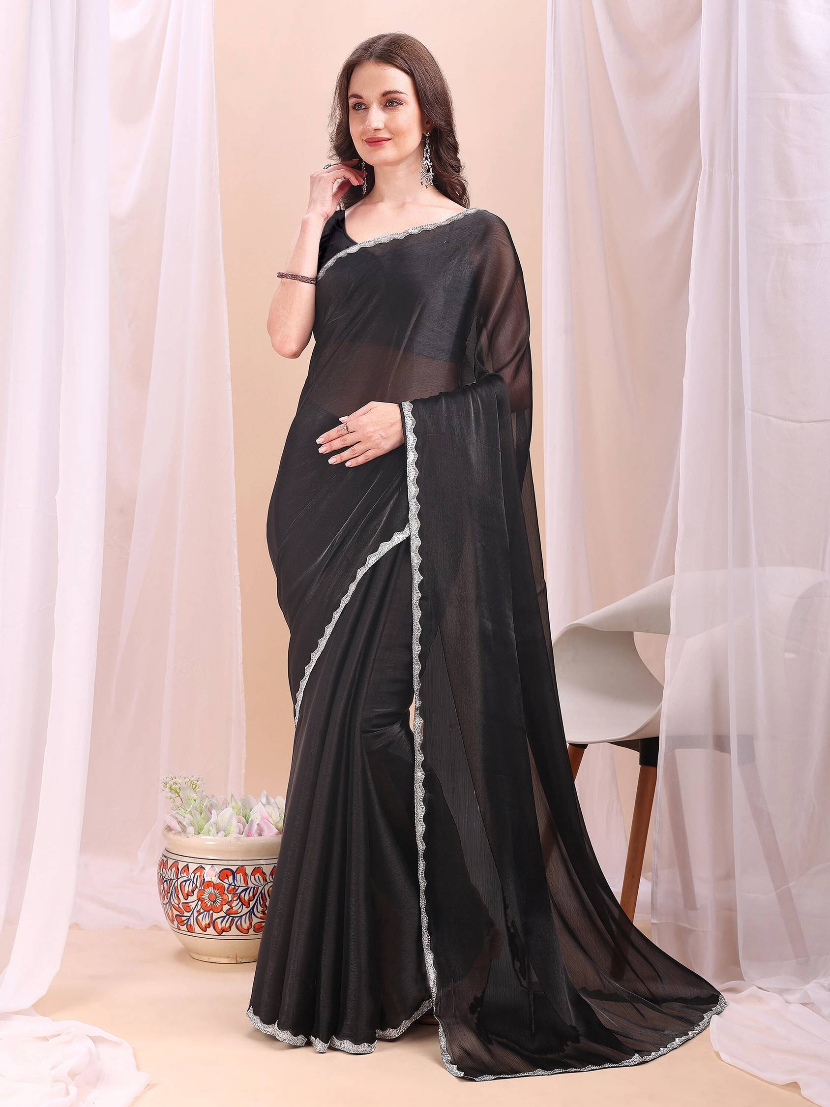 Elevate your ethnic wardrobe with this elegant saree, crafted from soft, lightweight fabric that drapes beautifully for a flattering silhouette. The saree features a shimmering sheen that adds a touch of glamour, while the silver scalloped lace border enhances its sophisticated appeal. Ideal for festive occasions, weddings, and evening parties, this saree is a timeless blend of simplicity and elegance. Pair it with statement jewelry and heels to complete your look.