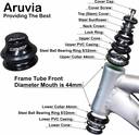 Upgrade or replace your threadless bicycle headset with this all-in-one 13-piece headset kit from Aruva. Designed for bicycles with a 44mm head-tube inner diameter (fits standard 1-1/8" threadless forks), this kit includes every essential component needed for a smooth, reliable steering experience. The set comprises upper and lower cones, lock ring, crown race, steel ball bearings (5/32"), upper and lower PVC casings, and associated seals and spacers. Built to withstand regular riding, the components use durable materials for long life and corrosion resistance, ensuring consistent performance ride after ride.