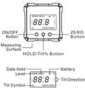 Material: Aluminium/ABS, Measuring range: 4*90 degree, Resolution: 0.1 degree, Accuracy: ±0.3 degree, Power supply: AAA*2 battery(NOT INCLUDED), Magnet: inside(BOTTOM ONLY), Repeatability: 0.1degree. Used for Absolute and Relative angle measurement in automotive, woodwork, building, drilling machinery etc. Magnet at the base of the device will help to mount it on the machinery. Battery: AAA*2 battery (NOT INCLUDED). Magnet on one side(BOTTOM ONLY) to mount on the Iron object to work conveniently hands free. Measuring range: 4*90 Degrees. Resolution: 0.05 Degrees. Accuracy: Plus/Minus 0.2 Degrees. Repeatability: 0.1 Degrees. FUNCTION: HOLD/Tilt%- Press it for long time, the unit can be changed from degree to tilt%. Press it for short time, the data will be held for convenient reading. ZERO- Data reset, to proceed with relative measurement. Long press to switch on LCD backlight. Portable size ,convenient to co-work with other measuring tools and enlarge measuring range.FUNCTION: HOLD/Tilt%- Press it for long time, the unit can be changed from degree to tilt%. Press it for short time, the data will be held for convenient reading. ZERO- Data reset, to proceed with relative measurement. Long press to switch on LCD backlight. Portable size ,convenient to co-work with other measuring tools and enlarge measuring range. With on-off power switch & Auto power-off option. Quick display of the measured value on big LCD screen.With on-off power switch & Auto power-off option. Quick display of the measured value on big LCD screen.