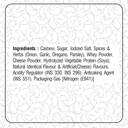 Nutrient Content | - Cashews, Palmolein Oil Spices (Red Chill Onion, Fennel, Fenugreek, Black Pepper, Cumin, Garlic, Asafoetida), lodized Salt, Sugar, Black Salt, Lemon Powder Spice Extracts, Spice Oleoresin, Acidity Regulator (INS 330, INS 296), Anticaking Ager (INS 551), Natural & Nature Identical Flavour, Packaging Gas [Nitrogen(E941)]