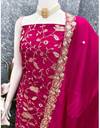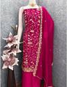 This unstitched Vichitra silk dress material. Adorned with delicate floral zari embroidery and sparkling stone accents, it creates a graceful and eye-catching appeal. The soft and lightweight Vichitra silk top drapes beautifully, paired with a matching embroidered dupatta and smooth Santoon bottom for all-day comfort. Ideal for festive occasions, cultural gatherings, or special celebrations, this dress material combines traditional charm with a refined look.