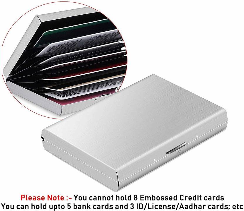 Stainless Steel Credit Card Holder SUPER SLEEK, STYLISH, AND STURDY You get Classic High Quality Credit Card Holders with Smooth Stainless Steel and Solid Construction that was Built to Last. You’ll love the feel, the looks, and the durability.so will everyone else who sees it! ULTRA SLIM AND PORTABLE Six sleeves firmly hold your Credit Cards, Debit Cards, Driver’s License, ID Cards, and other credit card size cards. Maximum Capacity: 7 cards (with 2 of the cards in one slot) or 6 cards + 3 folded bills. Small enough to keep hidden in your front pocket or purse – just half an inch thick! Perfect for Business, Travel, Shopping, and Daily Use. ULTIMATE CARD PROTECTION Enjoy peace of mind knowing your Cards and Identity are Safe and Secure. Accordion-style display fits cards securely like a glove, while the sturdy metal case ensures your cards. Keep Your Essential Cards Safe and Secure…in Style!