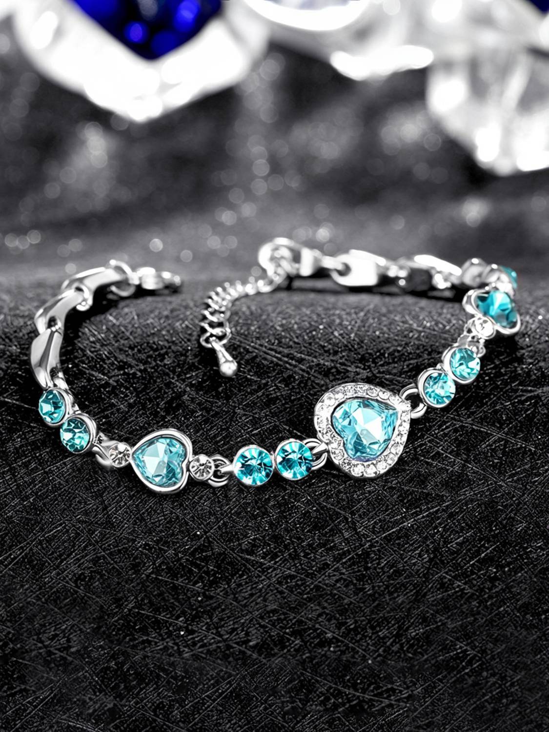 Inspired by Love, this meaningful sparkling Blue crystal bracelet features link of sparkling Hearts and drops. The Hearts are adorned with clear Ocean Blue crystals. A classic symbol of love, it makes a romantic addition to your Beautiful Bracelets collection. It add a touch of elegance to any outfit.