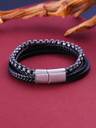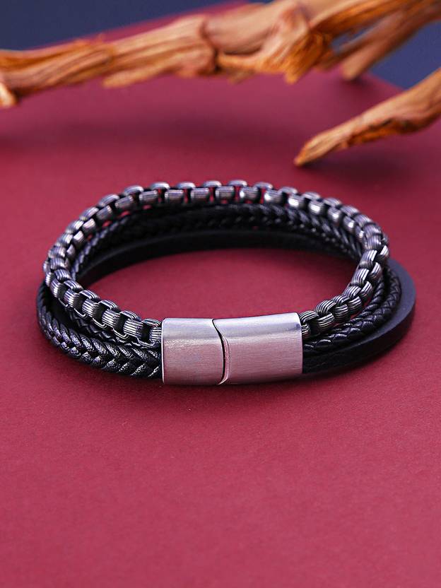 Yellow Chimes Handcrafted Braided Black Genuine Leather Stainless Steel Chain Magnetic-Clasp Bracelet for Men and Boys
