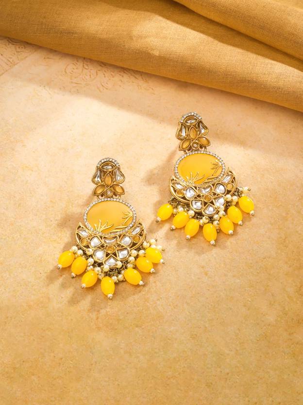 GORGEOUS DESIGN: Stunning yellow stone studded drop earrings blend tradition with modern style, perfect for any occasion. Striking design boldly enhances any outfit, ensuring you stand out with ease. Unique earring let you express your individuality and showcase your fashion sense.