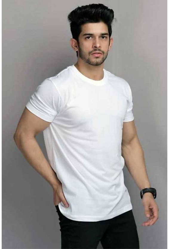YesCart white t-shirt 0741 Men Solid Round Neck Cotton Blend White T-Shirt