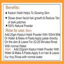 Natural & Pure Kasturi turmeric may helps in removing facial hair and pimple marks, when used for a longer time. When applied before taking bath it gives a glow to their skin. It is a natural way to care for your skin which may reduces blemishes and removes tan from your face. Special indications: for oily skin: make a paste of the turmeric powder with rose water and apply, wait for a few minutes and wash away. For dry skin: make a paste with raw milk and apply, rinse well after few minutes .For sensitive skin it is advised to first do a patch test on an emerging pimple or an arm to check sensitivity and apply rest of the area Make a paste with rose water, unboiled milk or sandalwood powder to whichever mix suits your skin type.A face pack is a powerful skincare solution designed to purify, refresh, and rejuvenate your skin. Formulated with natural and herbal ingredients, face packs help detoxify the skin by drawing out impurities, excess oil, and environmental pollutants from deep within the pores. Regular use can help minimize acne, reduce blemishes, and refine skin texture. Many face packs also include brightening agents like turmeric, sandalwood, clay, or fruit extracts that enhance your natural glow and even out skin tone. Suitable for all skin types, they provide a soothing and cooling sensation that relaxes the skin, making them perfect for weekly skincare routines or pre-event facials.