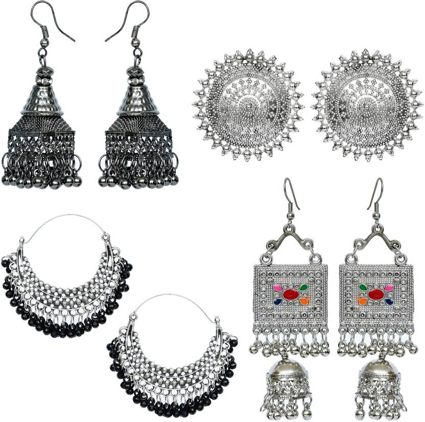 Silver Oxidised earrings Combo for women and girls. You Will get 4 Pair Earrings which includes Black Oxidised Jalidar Jhumka, Big Round Stud, Silver Oxidised Chandbali with Black beads and Square Jhumka Tassel. Made with high quality, allergen free material, Safe for Skin. Latest Designs Made in India for Beautiful Indians like you.